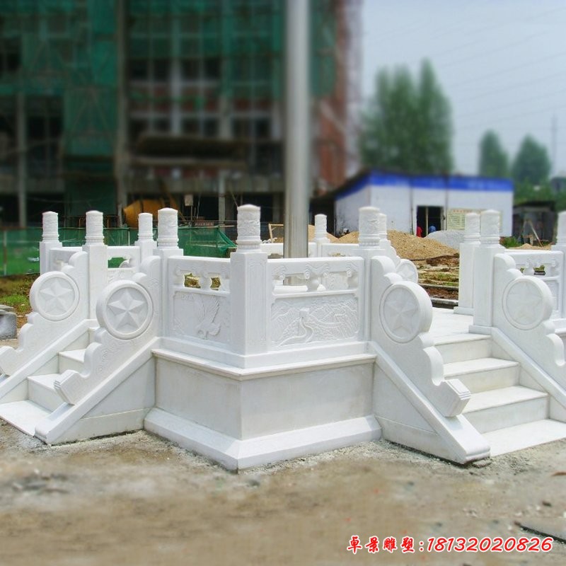 汉白玉旗台表面洁白无瑕,质地坚实而又细腻,非常容易雕刻。汉白玉升旗台主要是用来装饰,一此来表示对国旗神圣不可冒犯,而且汉白玉是纯洁的象征。使用汉白玉升旗台,不同的地方使用的栏杆雕刻的花纹是各有不同的,在政府门前使用汉白玉栏杆的话,栏杆上面一般是雕刻花草之类的图案,而在学校、部队、公司一般也都是雕与其本身相关的图案。
